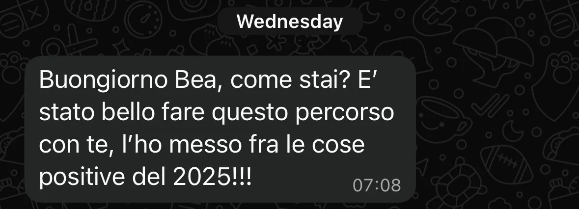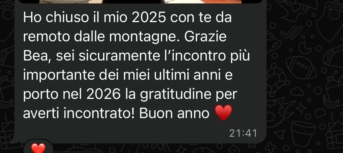 Il suo percorso è stato ed è per me tutt’oggi il mio ossigeno. Ossigeno si, perché mi mancava il respiro e solo grazie a lei ho ridato aria ai miei polmoni. Ho deciso di abbandonare la terapia con la psicologa per intraprendere questa strada e nella prima call con Bea ho capito subito che era la persona giusta… non so spiegarlo, è come se mi avesse letto dentro in un istante ed io mi sono sentita per la prima volta “capita”, e per la prima volta non ho avuto paura.