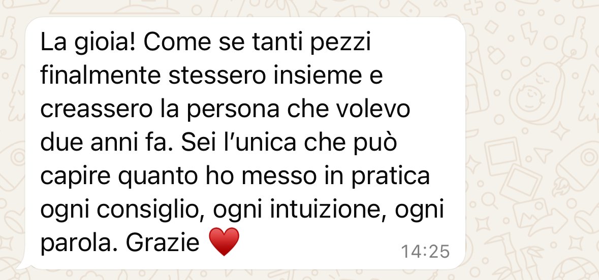 Questo percorso insieme ha riacceso dentro di me la voglia di essere coraggiosa, di vivere la vita pienamente senza nascondere le mie insicurezze in scuse e senza procrastinare le scelte. Dopo questi tre mesi insieme mi sento consapevole, ricca (di strumenti, di spunti, di pensieri, di futuro) e immensamente grata. Risceglierei questo percorso mille volte e lo consiglierei a chiunque abbia voglia di conoscersi senza paura. Grazie. Con tutto il cuore."